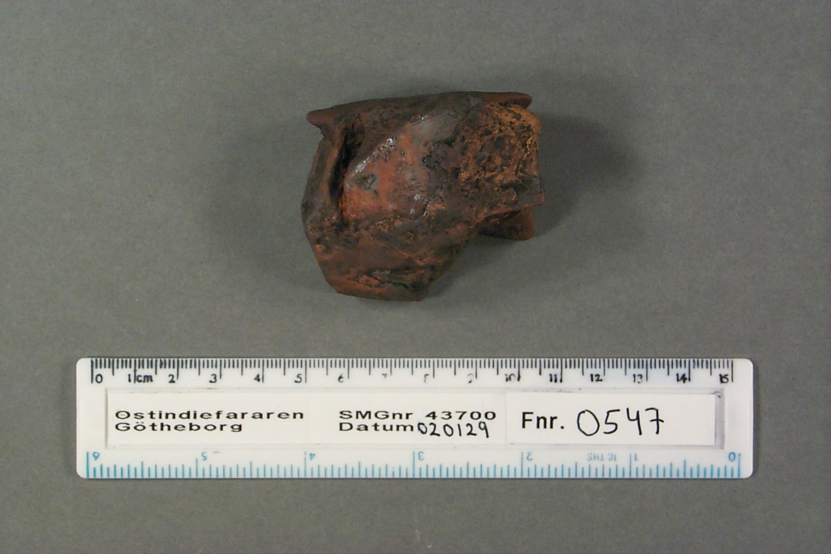 Föremålet är från vraket av ostindiefararen Götheborg, som gjorde tre resor till Kina 1739-45. Vid hemkomsten från den sista resan 12 september 1745 förliste fartyget vid grundet Hunnebådan strax utanför Nya Elfsborgs fästning. Vid flera tillfällen har material tagits upp från vraket. Föremålet kommer från de marinarkeologiska utgrävningarna på platsen 1986-1992.