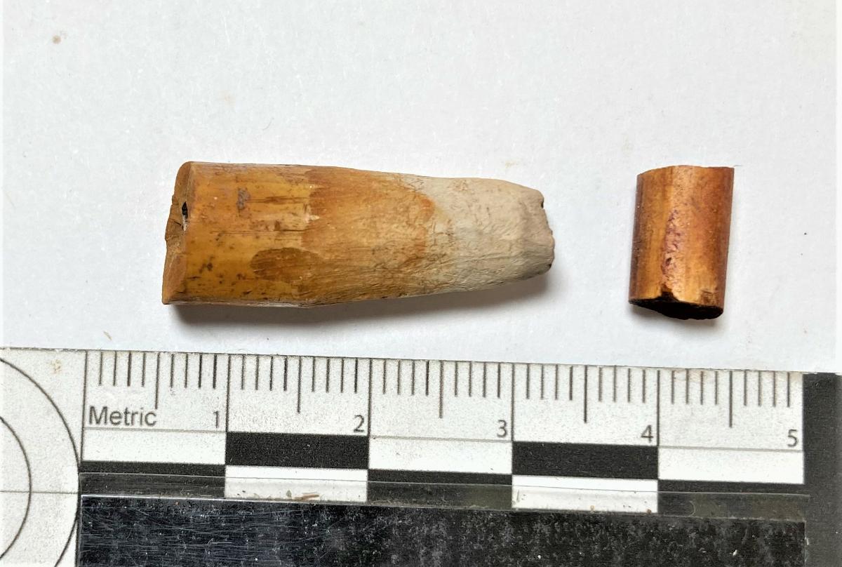 Skaft, del av, munstycke. Nött och slitet efter användning. Har varit lackad.