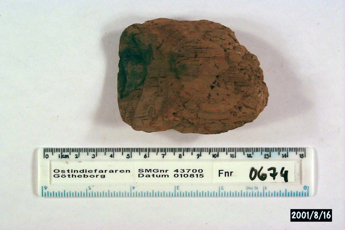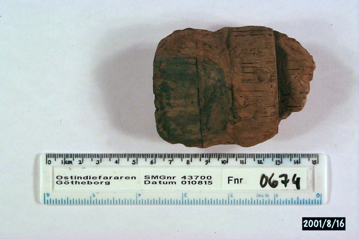 Föremålet är från vraket av ostindiefararen Götheborg, som gjorde tre resor till Kina 1739-45. Vid hemkomsten från den sista resan 12 september 1745 förliste fartyget vid grundet Hunnebådan strax utanför Nya Elfsborgs fästning. Vid flera tillfällen har material tagits upp från vraket. Föremålet kommer från de marinarkeologiska utgrävningarna på platsen 1986-1992.