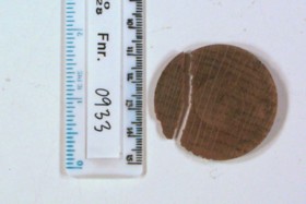 Tunn cirkulär skiva, svarvad/sågad. Spår av svarvning, lätt uppskjutande cirkulär del i mitten d: 18 mm. Avbruten, 2 delar.