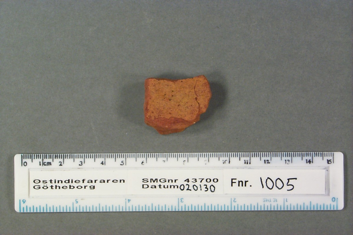 Föremålet är från vraket av ostindiefararen Götheborg, som gjorde tre resor till Kina 1739-45. Vid hemkomsten från den sista resan 12 september 1745 förliste fartyget vid grundet Hunnebådan strax utanför Nya Elfsborgs fästning. Vid flera tillfällen har material tagits upp från vraket. Föremålet kommer från de marinarkeologiska utgrävningarna på platsen 1986-1992.