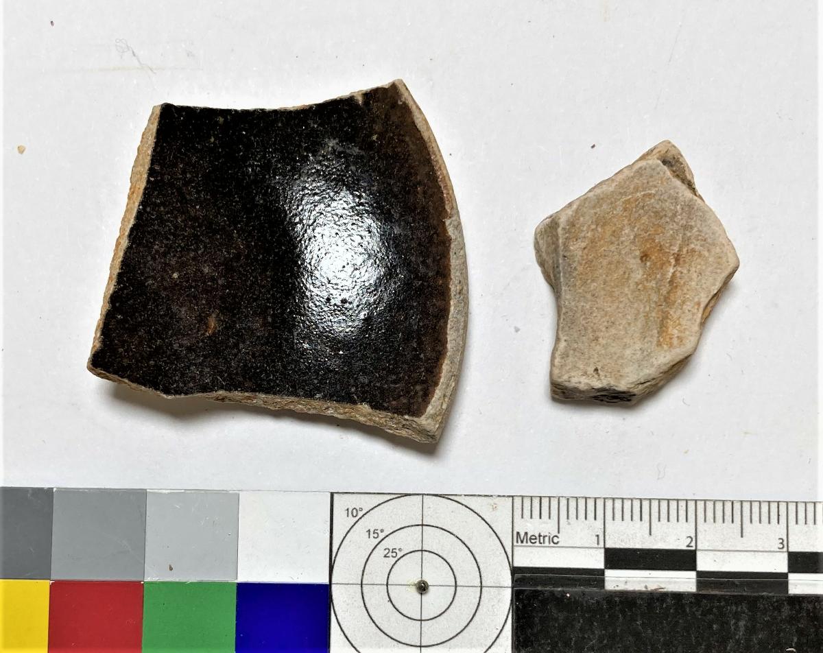 Kärl, del av, bottendel av lågt fat, överdelen har avrundad kantavslutning. Ljust gods med mörkbrun blank glasyr på insidan.