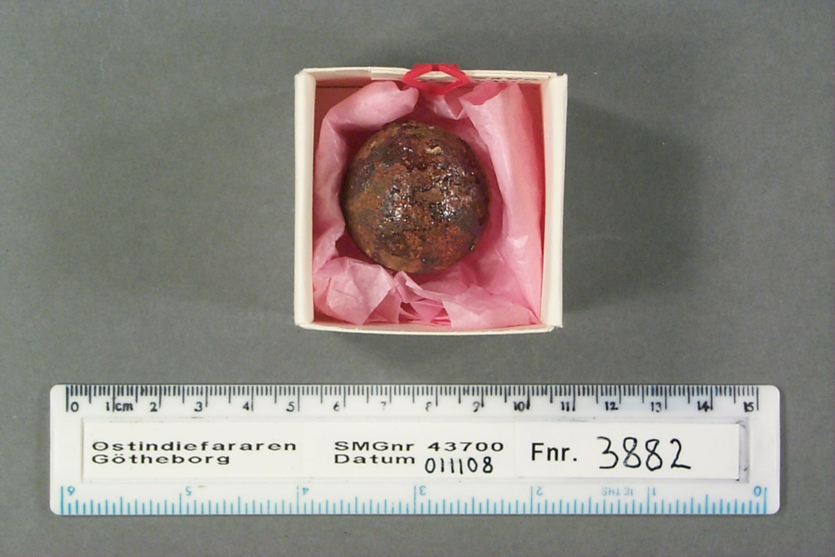 Föremålet är från vraket av ostindiefararen Götheborg, som gjorde tre resor till Kina 1739-45. Vid hemkomsten från den sista resan 12 september 1745 förliste fartyget vid grundet Hunnebådan strax utanför Nya Elfsborgs fästning. Vid flera tillfällen har material tagits upp från vraket. Föremålet kommer från de marinarkeologiska utgrävningarna på platsen 1986-1992.