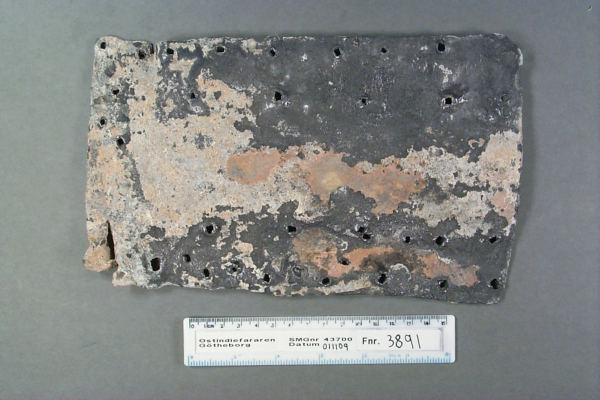 1) Blyplåt. Ett stort antal genomgående hål, fyrkantiga, för fastsättning. Konkretioner, mycket på ena sidan, något mindre på andra sidan.