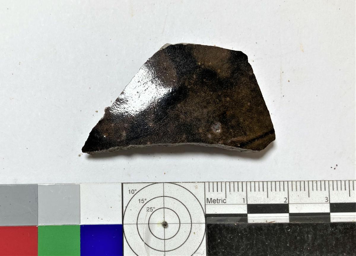 Skärva av kärl, lätt välvd, grått gods, brun matt insida, mörkbrun/olivgrön blank glasyr på insidan.