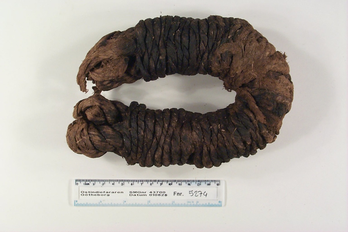 Blockstropp av treslagen kabel d: ca 45 mm, varje tross d: 24 mm. Kabeln klädd med 5 mm lårding runt bukten, klädningen avbruten där kabeln är avbruten.