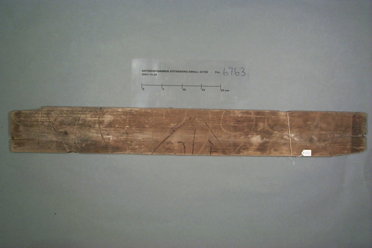 Föremålet är från vraket av ostindiefararen Götheborg, som gjorde tre resor till Kina 1739-45. Vid hemkomsten från den sista resan 12 september 1745 förliste fartyget vid grundet Hunnebådan strax utanför Nya Elfsborgs fästning. Vid flera tillfällen har material tagits upp från vraket. Föremålet kommer från de marinarkeologiska utgrävningarna på platsen 1986-1992.