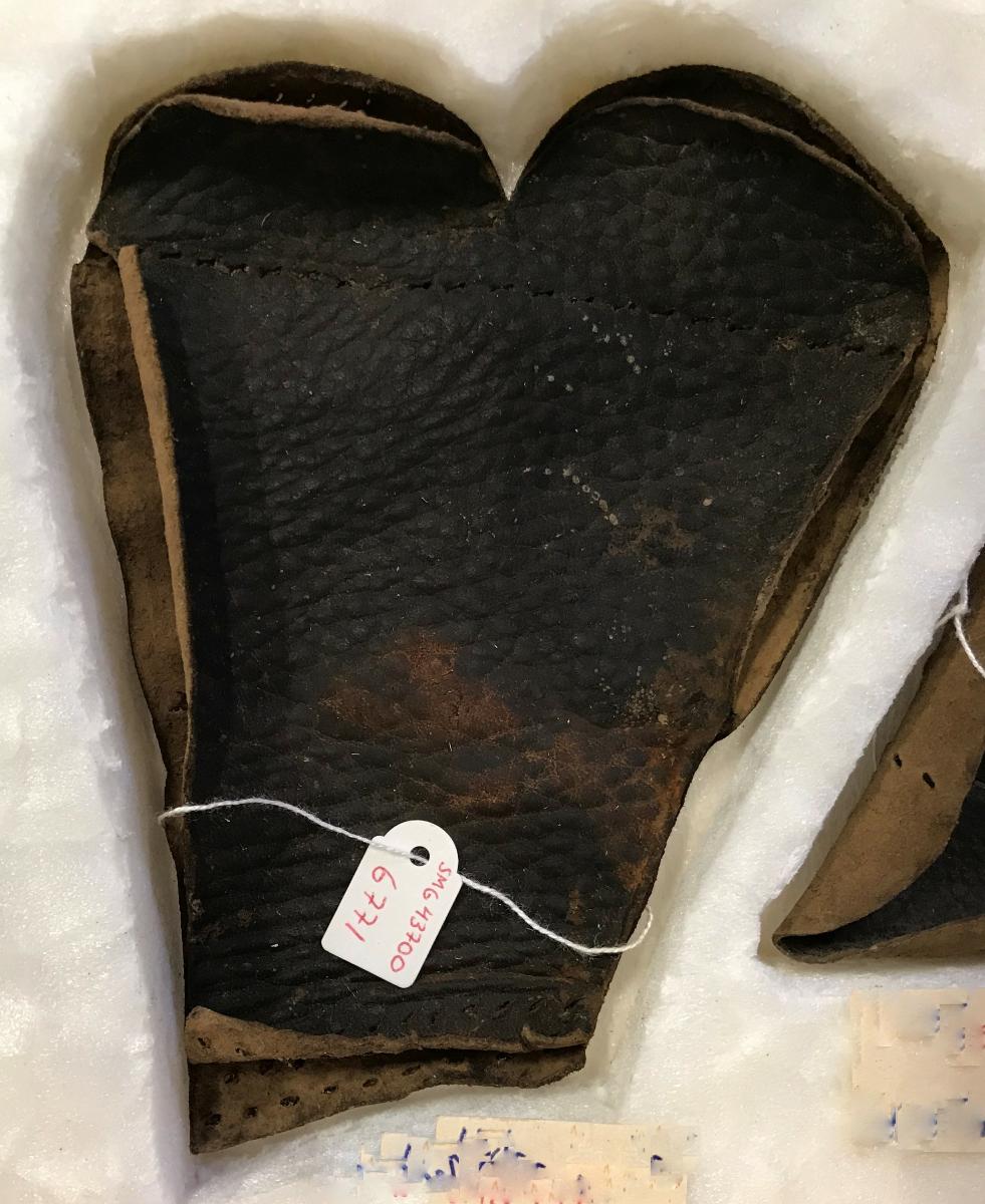 Hjärtformat läderstycke, sömshål i dubbla rader längst ner, i en rad tvärs över det bredaste stället samt på de rundade översta delarna. Sömshål efter kastsöm på baksidan, endast genom köttsidan. Har skiktat sig men sitter ihop. Har krullat sig vid torkning.