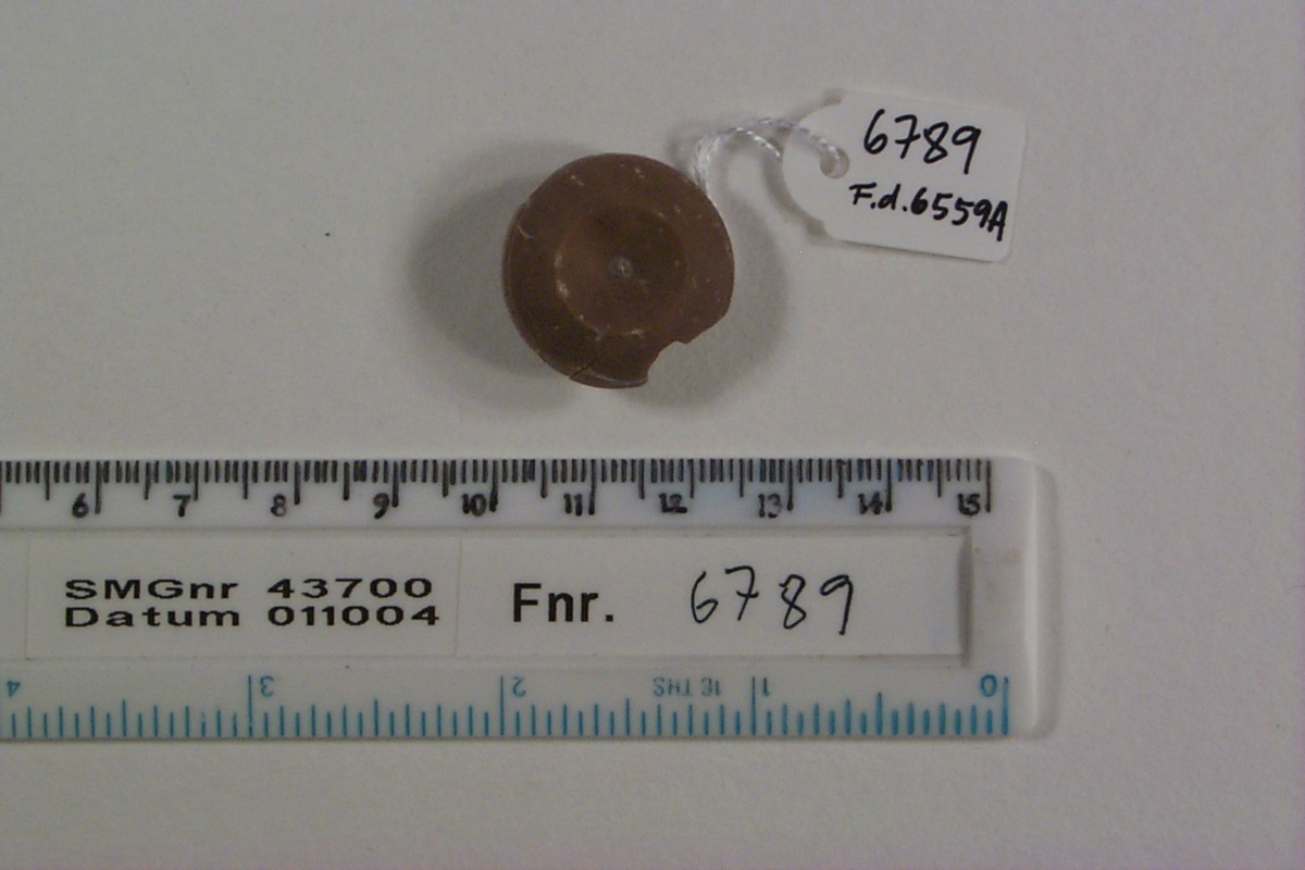 Undersydd knapp; med låg fot med genomgående hål för tråd, brätte svagt koniskt. Avbruten del i kanten, liten spricka i kanten av brättet.