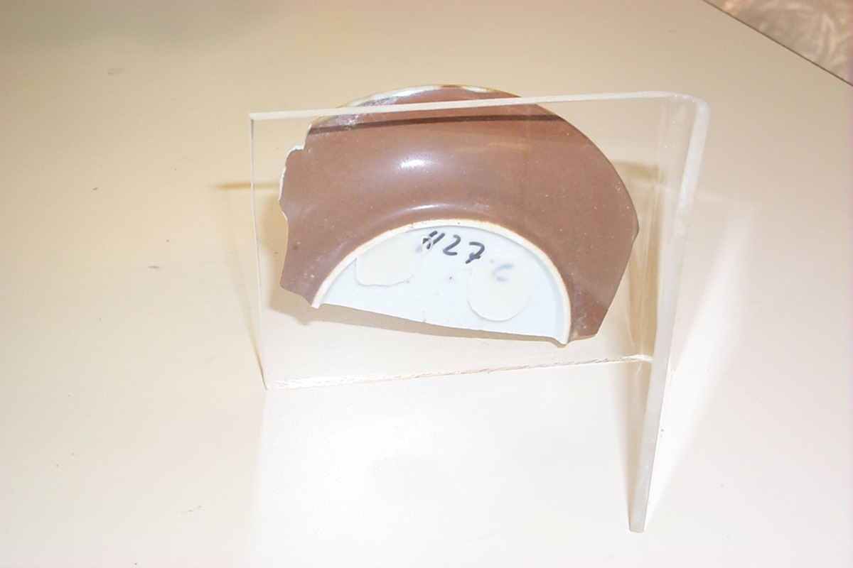 Skärva av fat, kategori C, Underglasyrblå dekor på insidan och brun glasyr på utsidan.