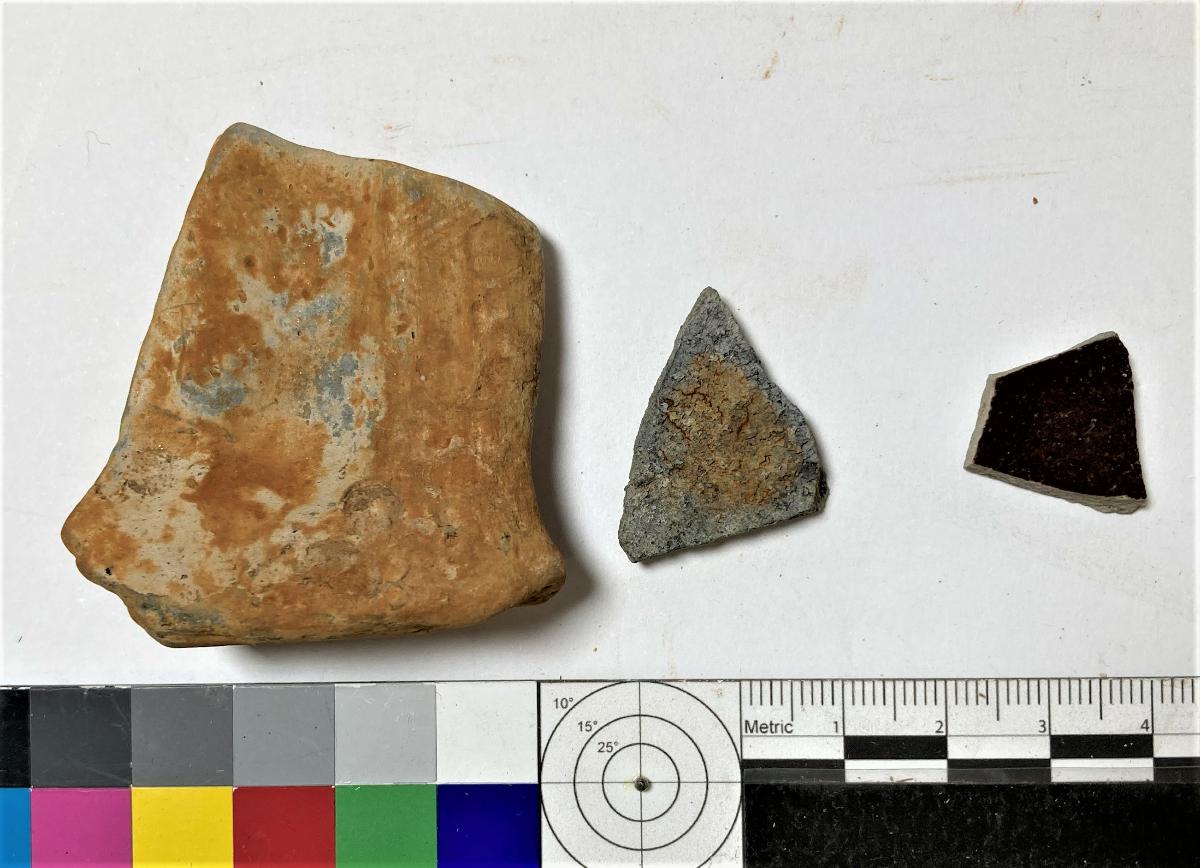 Botten- eller kantdel, ljust gods, ej glaserat, missfärgat av rost.