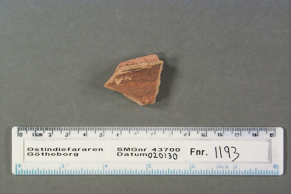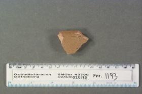 Föremålet är från vraket av ostindiefararen Götheborg, som gjorde tre resor till Kina 1739-45. Vid hemkomsten från den sista resan 12 september 1745 förliste fartyget vid grundet Hunnebådan strax utanför Nya Elfsborgs fästning. Vid flera tillfällen har material tagits upp från vraket. Föremålet kommer från de marinarkeologiska utgrävningarna på platsen 1986-1992.