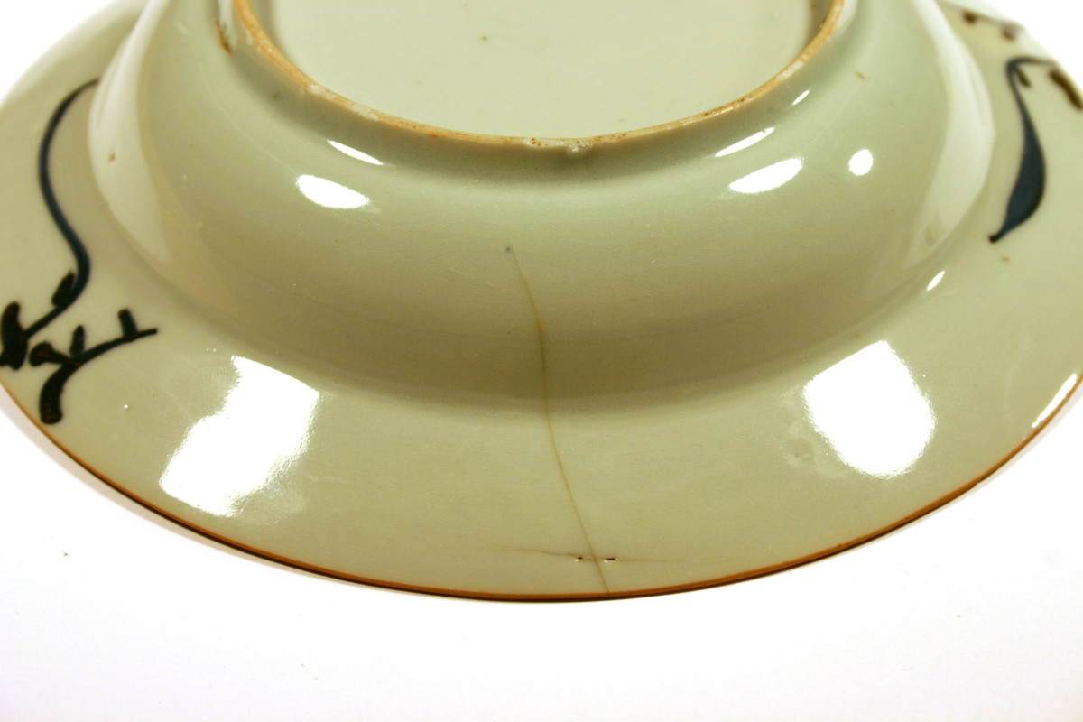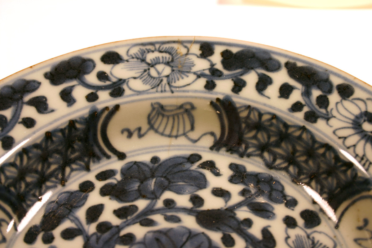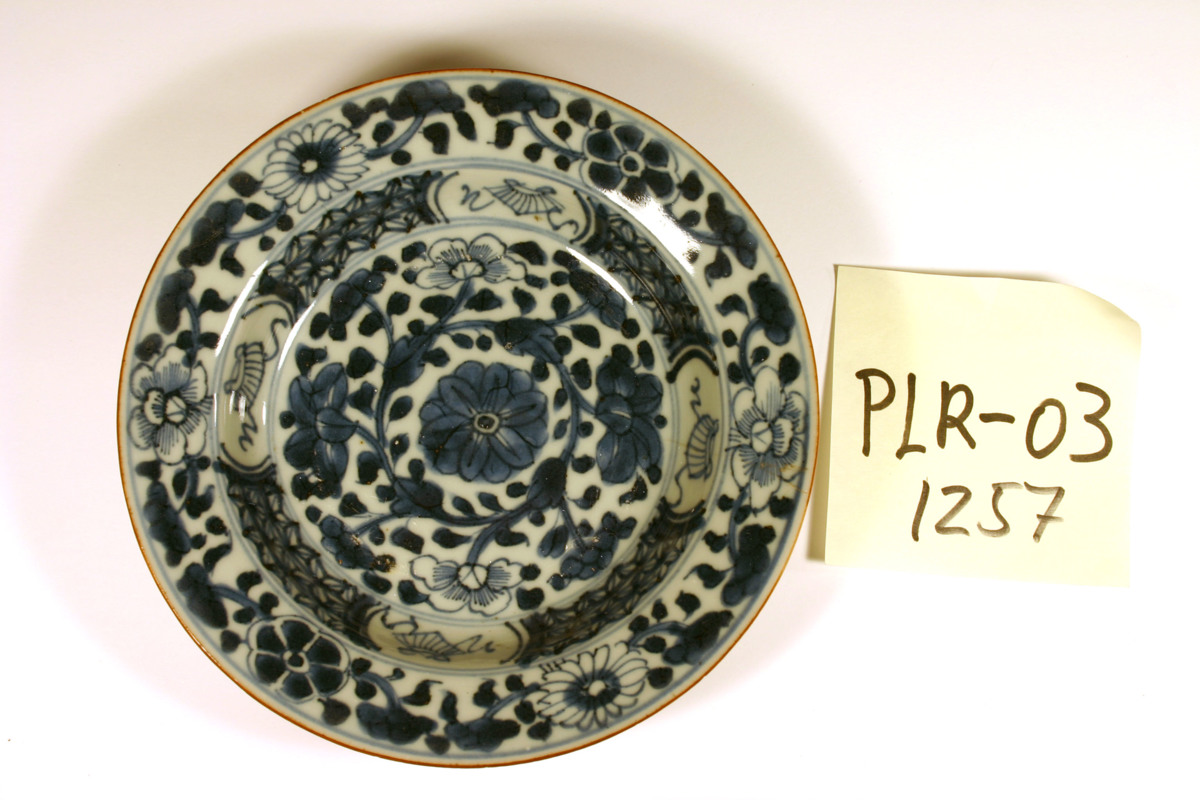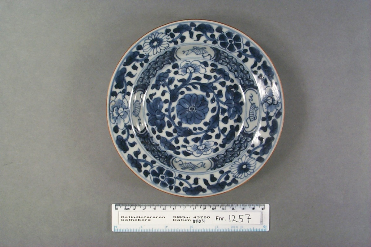 Kategori A; Underglasyrblå dekor; motiv: I botten en ranka av pion och gardenia, i kälningen en stjärnbård med blomreserver och runt brättet pion, krysantemum och prunus. Kvistrankor på brättets baksida. Brun mynningskant. Fin spricka i ena kanten.