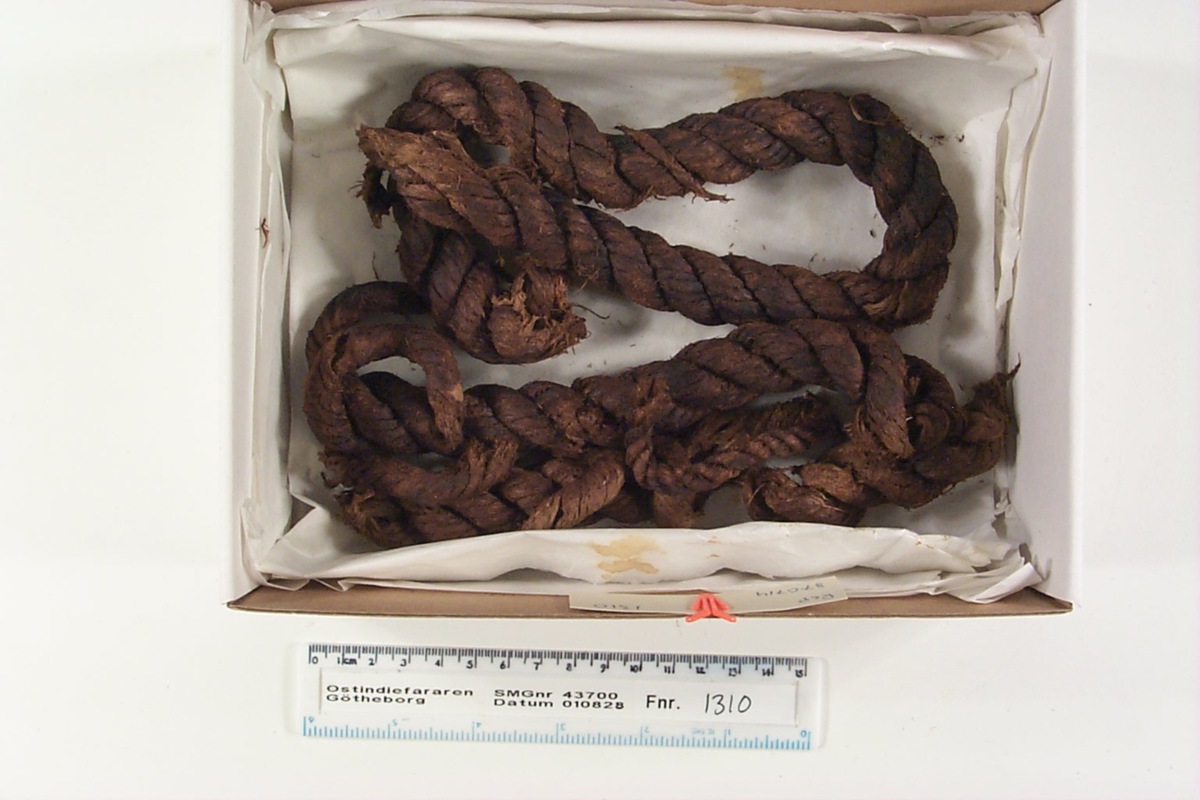 Föremålet är från vraket av ostindiefararen Götheborg, som gjorde tre resor till Kina 1739-45. Vid hemkomsten från den sista resan 12 september 1745 förliste fartyget vid grundet Hunnebådan strax utanför Nya Elfsborgs fästning. Vid flera tillfällen har material tagits upp från vraket. Föremålet kommer från de marinarkeologiska utgrävningarna på platsen 1986-1992.