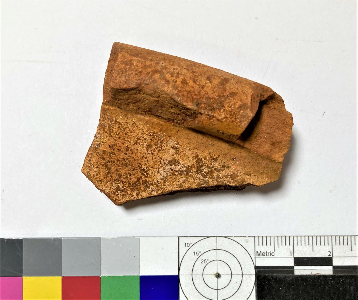 Skärva av kärl, kantbit, kraftigt gods, orange gods med guliriserande glasyr.
