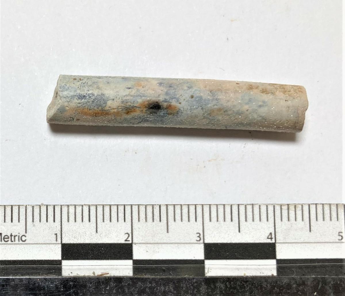 Avbrutet i båda ändar, ingen dekor. Grå.