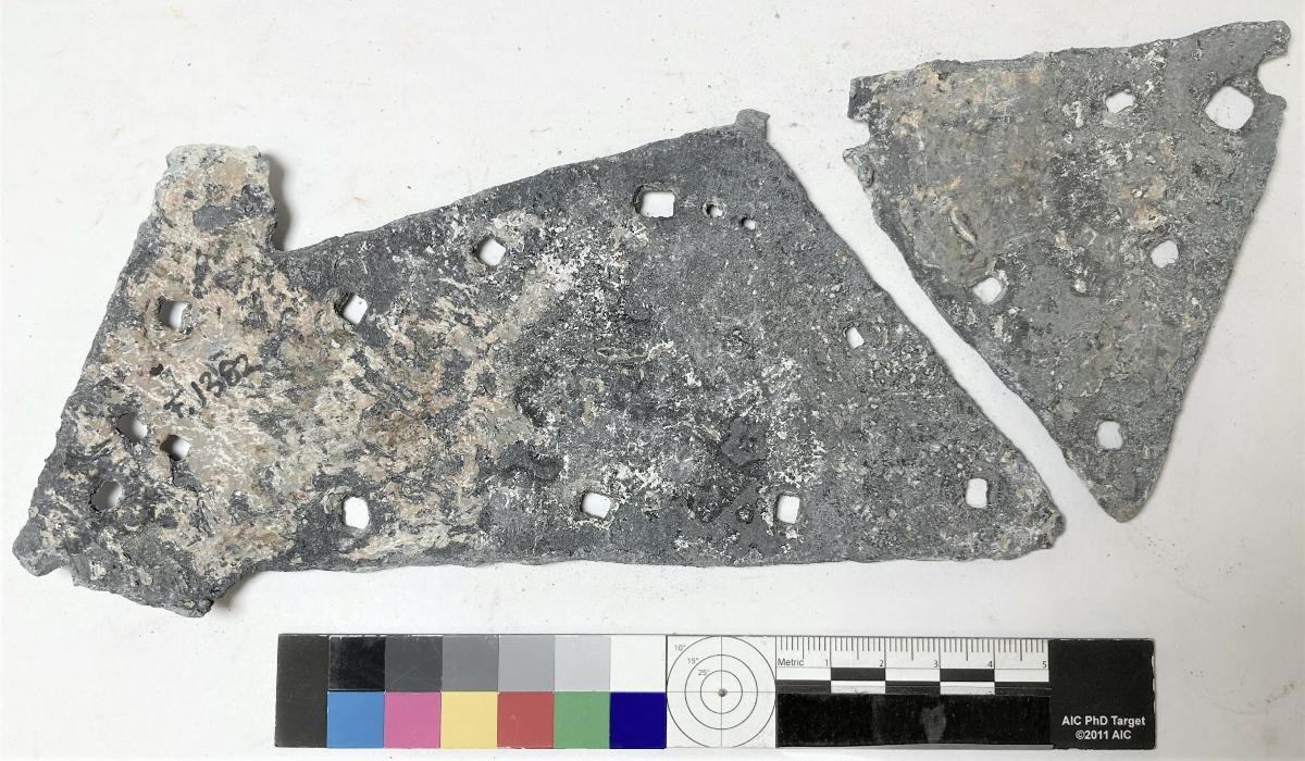 2) Triangulär platta, liksidig, s: 100 mm. 6 fyrkantiga spikhål efter fastsättning. Kalkbeläggningar.