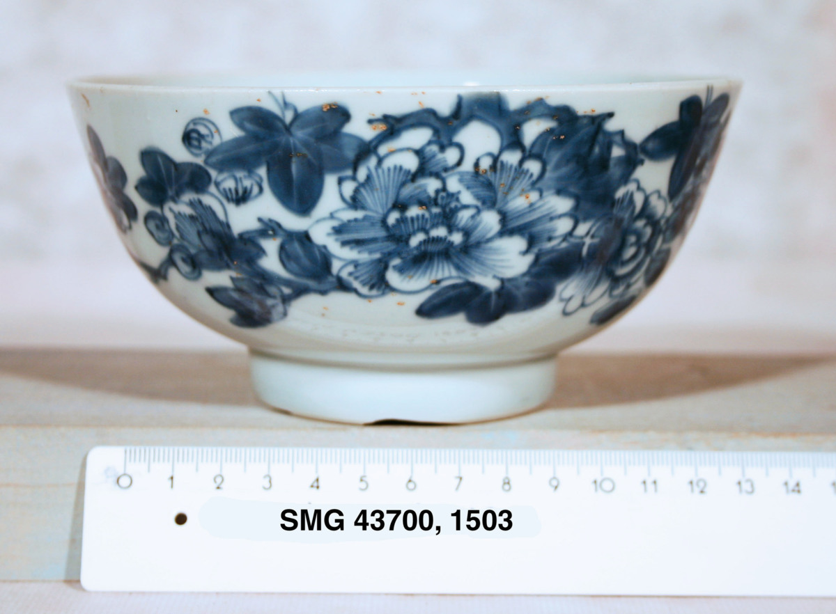 Kategori A: Underglasyrblå dekor. Motiv: blomma i mitten på botten på insidan, blommor och blad på utsidan.