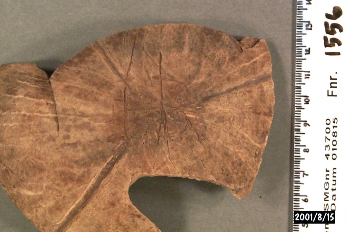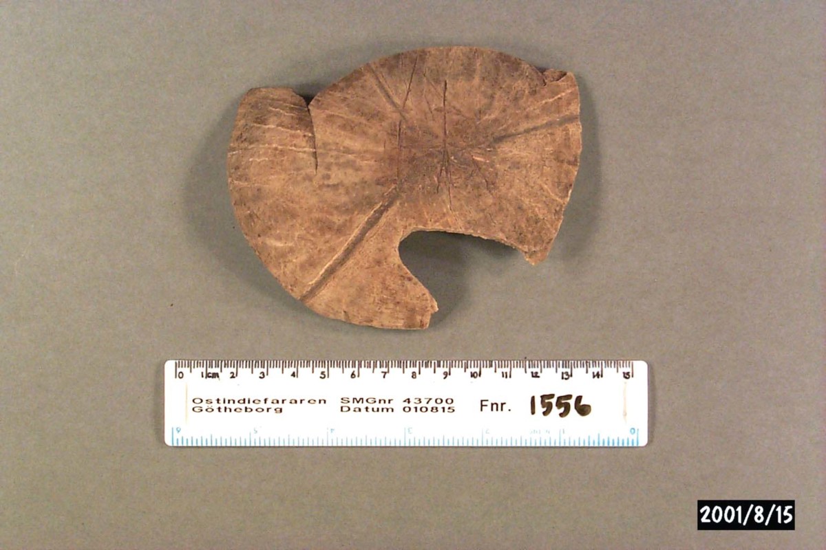 Del av kokosnötskal. Bearbetat. Bomärke inristat: sammanskrivet HB. Hör samman med fnr. 1158.