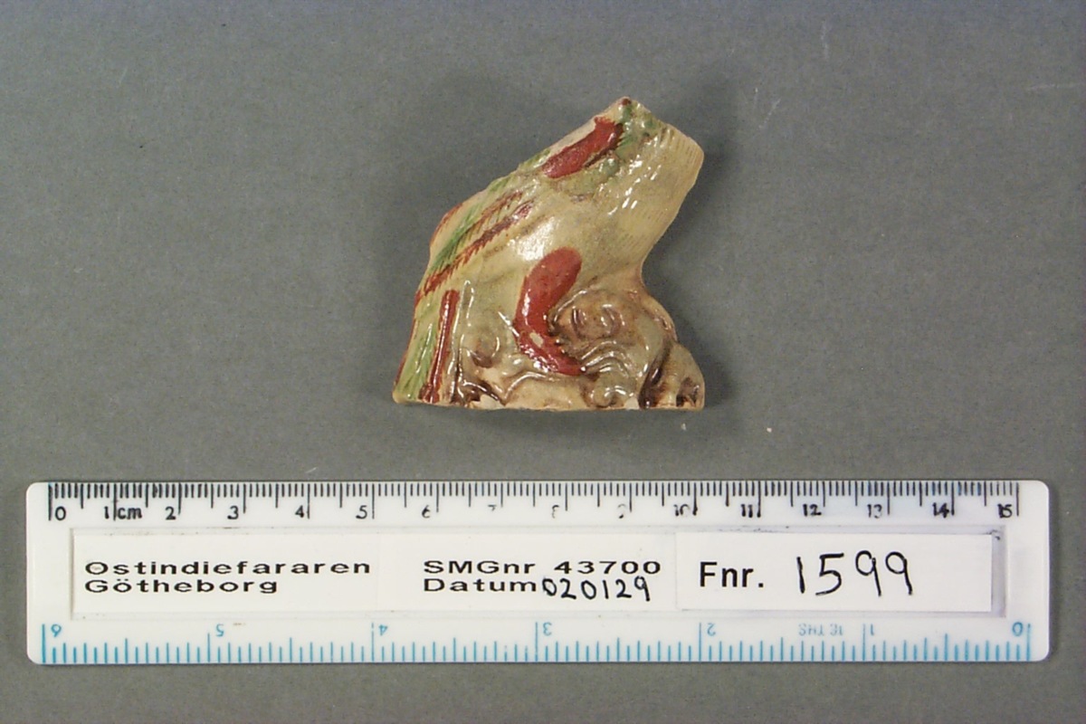 Ena sidan av halv undulat, övre delar och huvud saknas. Gul, grön och röd glasyr.