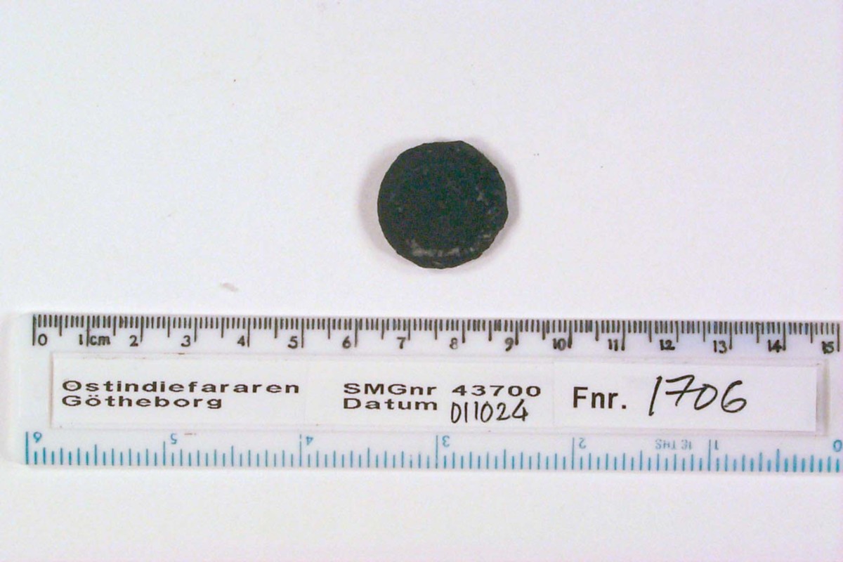 Föremålet är från vraket av ostindiefararen Götheborg, som gjorde tre resor till Kina 1739-45. Vid hemkomsten från den sista resan 12 september 1745 förliste fartyget vid grundet Hunnebådan strax utanför Nya Elfsborgs fästning. Vid flera tillfällen har material tagits upp från vraket. Föremålet kommer från de marinarkeologiska utgrävningarna på platsen 1986-1992.