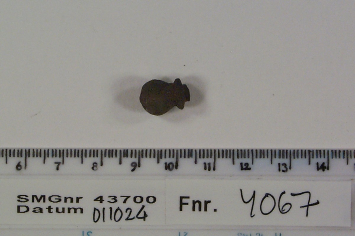 Liten knopp, klotformad med krage, avbruten vid kragen.