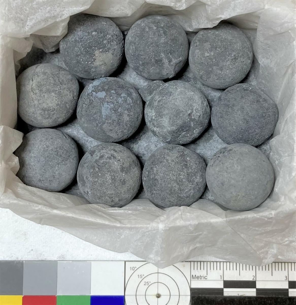 Muskötkulor, 23 st. Några med gjutkanter. Dammiga, löst korrosionsskikt.