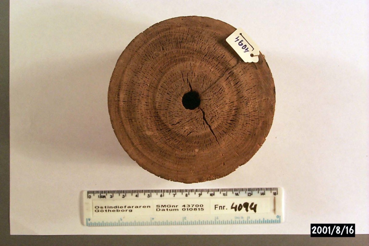 Föremålet är från vraket av ostindiefararen Götheborg, som gjorde tre resor till Kina 1739-45. Vid hemkomsten från den sista resan 12 september 1745 förliste fartyget vid grundet Hunnebådan strax utanför Nya Elfsborgs fästning. Vid flera tillfällen har material tagits upp från vraket. Föremålet kommer från de marinarkeologiska utgrävningarna på platsen 1986-1992.