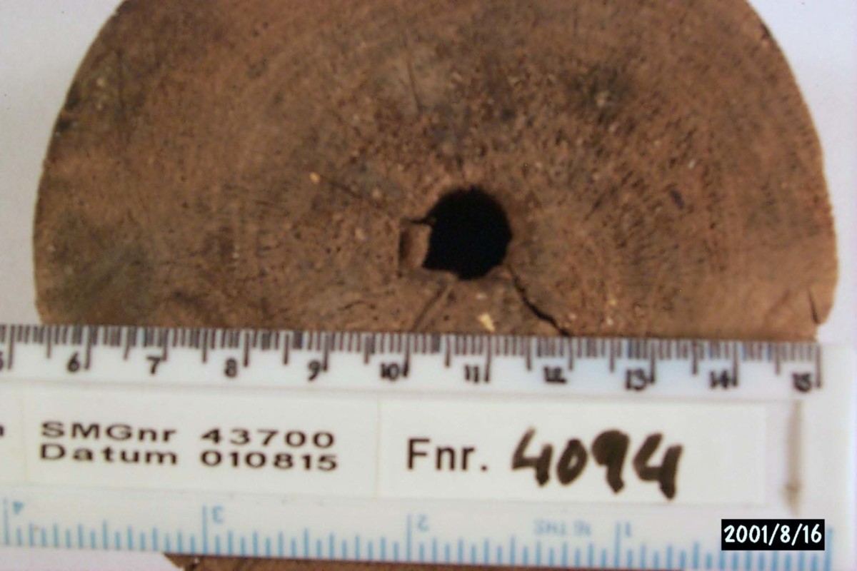 Svarvad, genomgående hål i centrum d: 12 mm. På baksidan i hålets kant finns en kvadratisk urfasning med en liten kil i. Kilen lös.