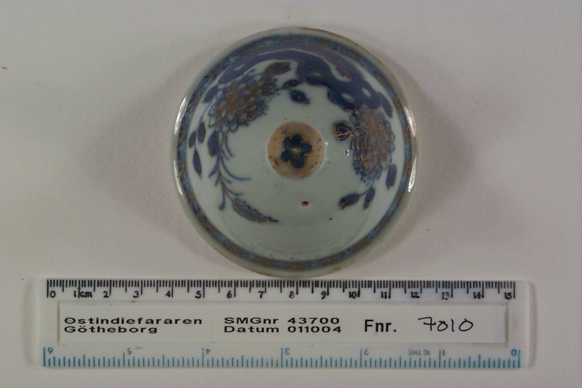 Lock till kanna el. likn. Toppigt med droppformad knopp. Kant undertill för passning i kanna. Kategori B; Underglasyrblå dekor och emaljfärger på glasyren, s.k. Kinesiskt Imariporslin. Emaljfärgerna i guld. Glaserad på insidan av kupan, oglaserad på kanten undertill. Genomgående litet hål, d: 2 mm, i kupan. Mycket välbevarad.
