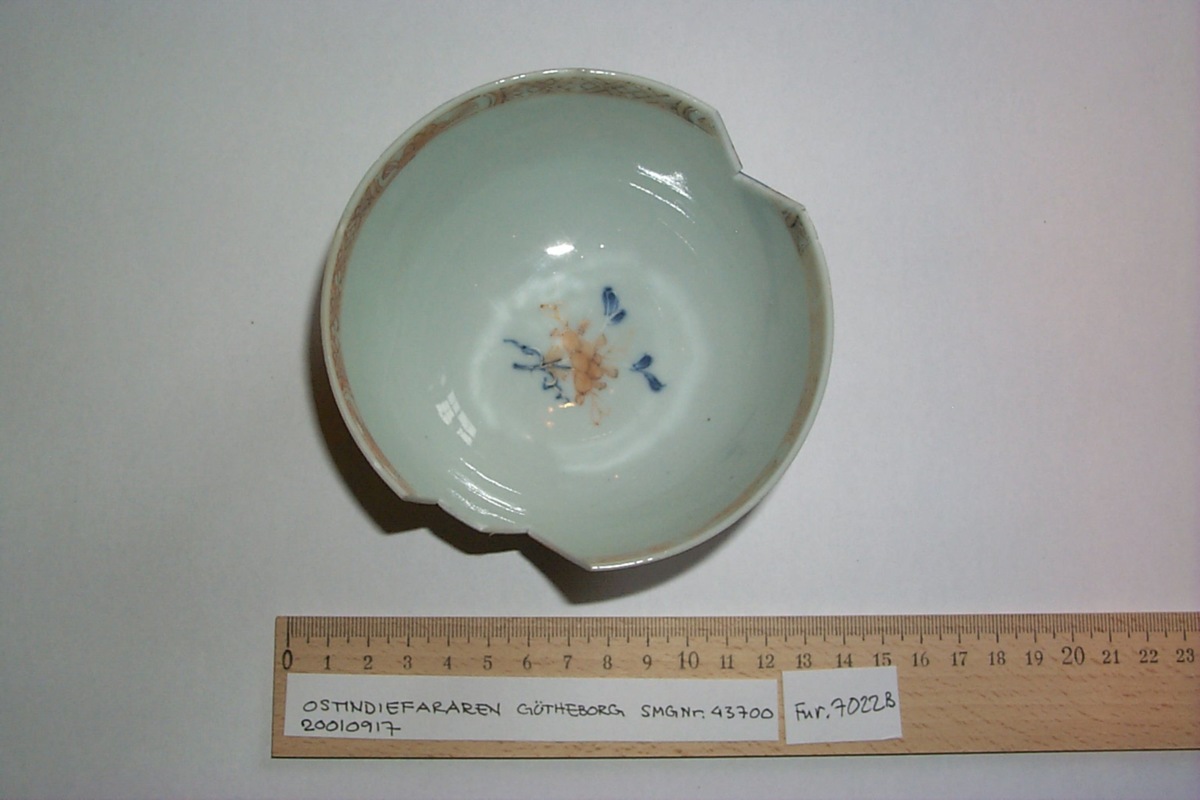 Skål, kategori B: Underglasyrblå dekor och emalfjärger på glasyren, s.k. Kinesiskt imariporslin. Två skärvor avslagna.