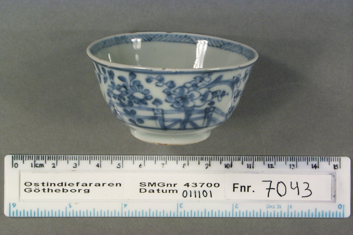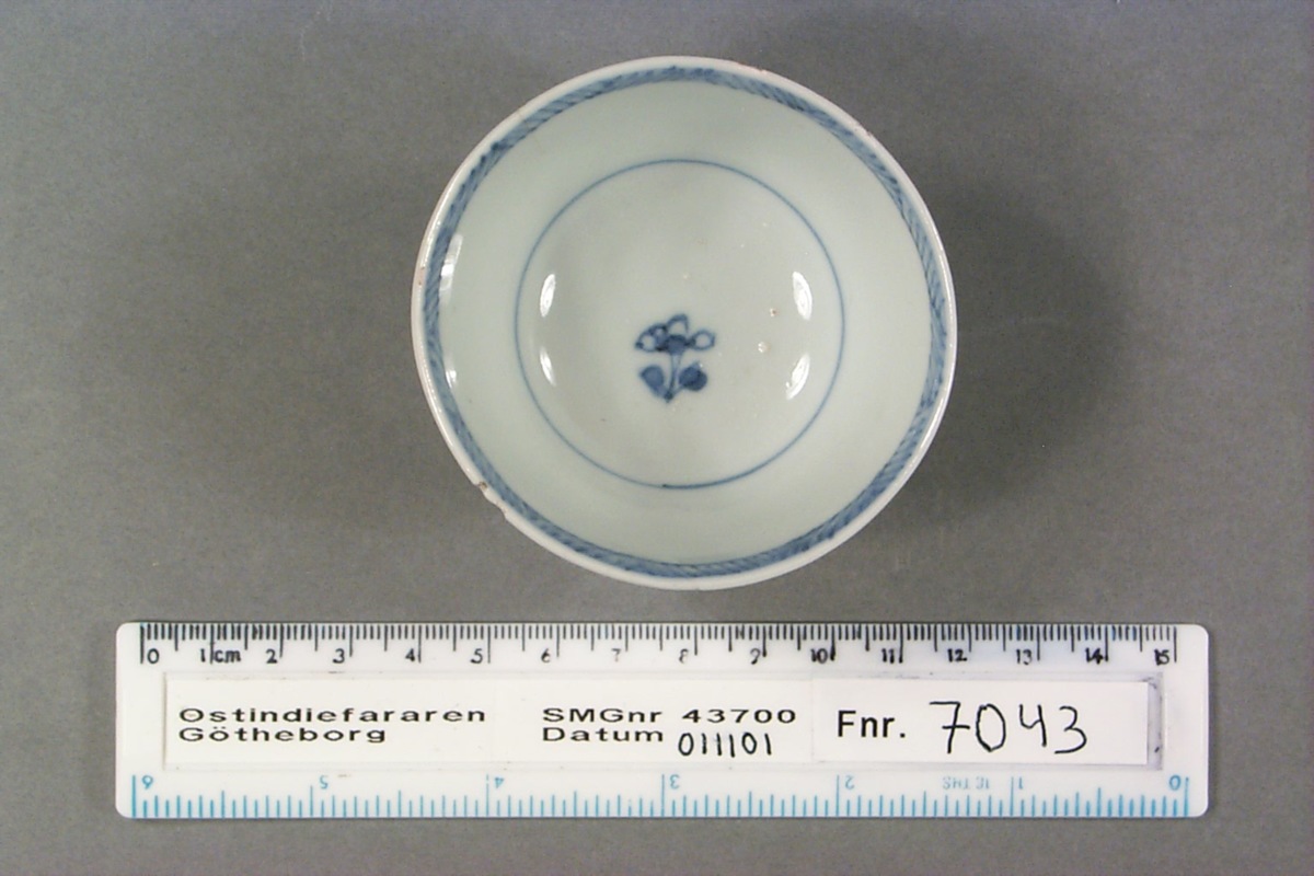 Kateogri A; Underglasyrblå dekor. Dekor; blommor på utsidan, kantband samt enkel blomma på insidan. Fem kantavslag i mynningskanten, fin spricka i ena kanten.