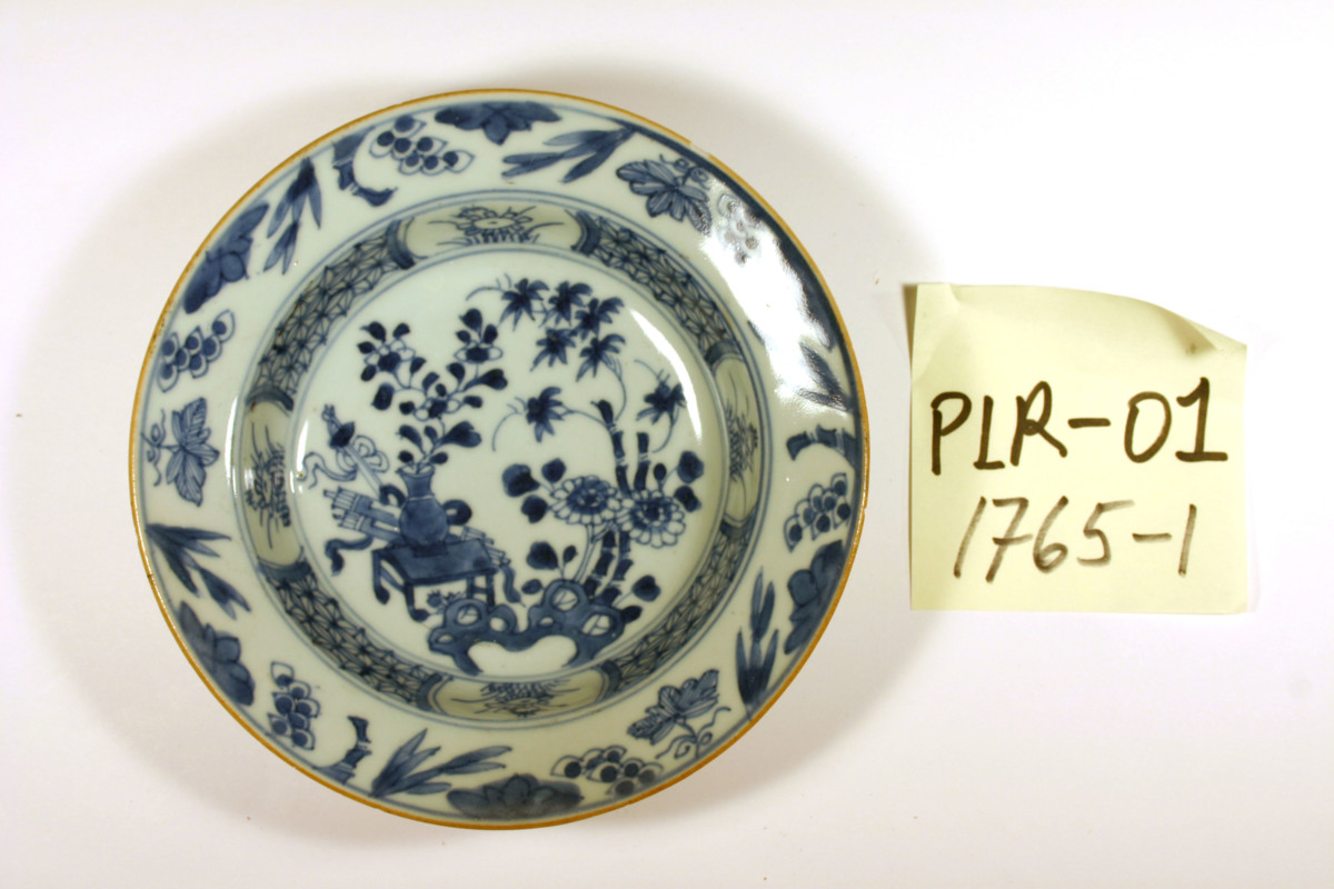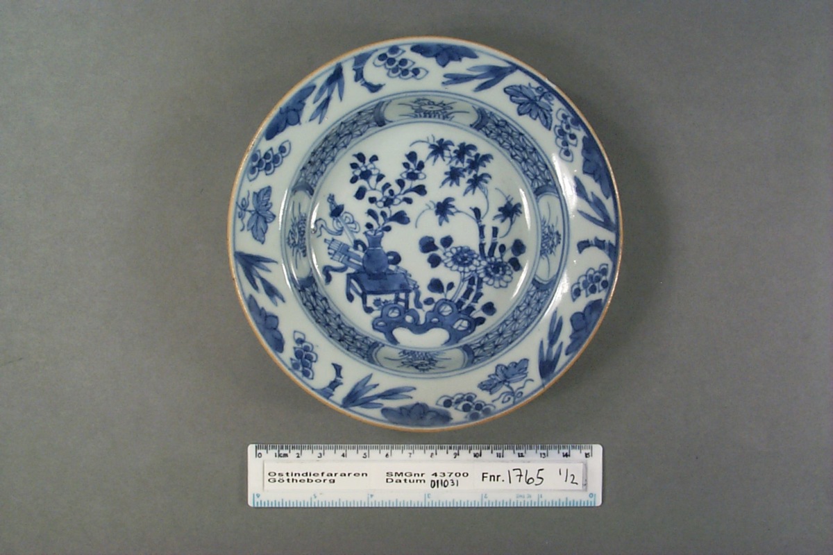 Kategori A; Underglasyrblå dekor; motiv: Mittmotivet "Hundra antikviteter", i kälningen en stjärnbård med blomreserver och runt brättet vindruvor och bambu. Kvistrankor på brättets baksida. Brun mynningskant.
