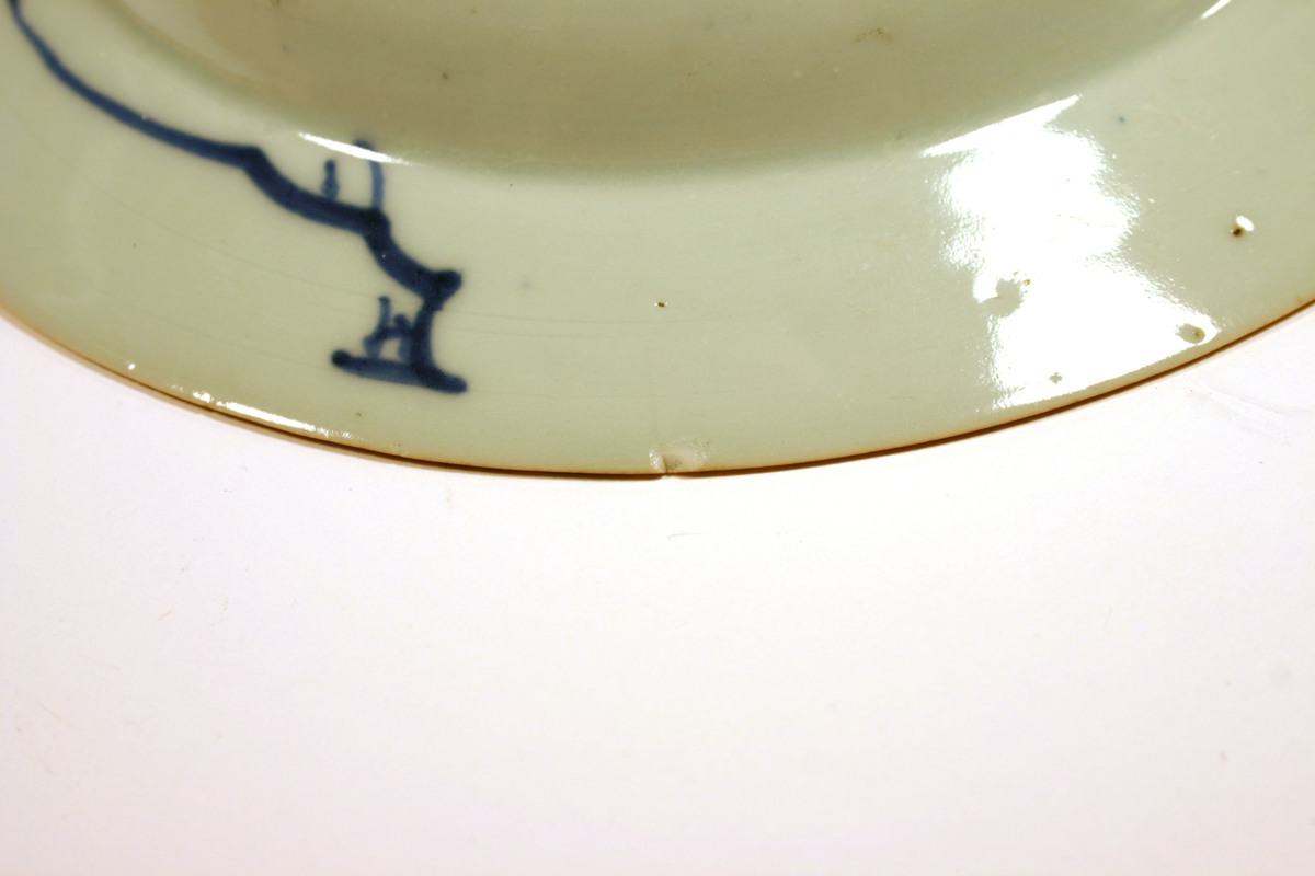 Flis 2x2 mm mestadels från undersidan av brätteskanten saknas. Från skadan går en 10 mm lång spricka på undersidan av brättet.