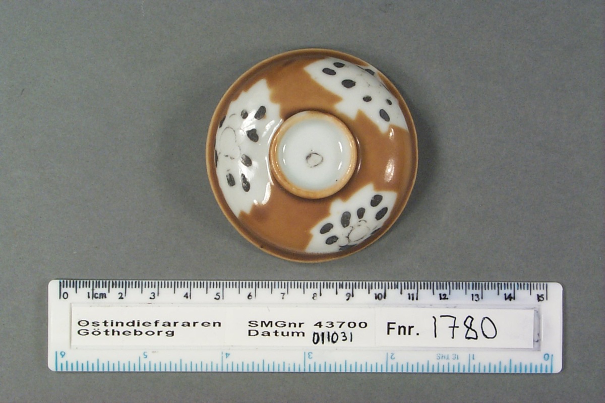 Lock till burk. Välvt med skålformat "handtag" i mitten på ovansidan, oglaserad kant, på undersidan, för passning i burken. Kategori D; brun glasyr med tre ursparningar i form av löv, som dekorerats med emaljfärger. Emaljfärgerna är lösa och känsliga och har mestadels fallit av, de som är kvar är svarta i färgen.