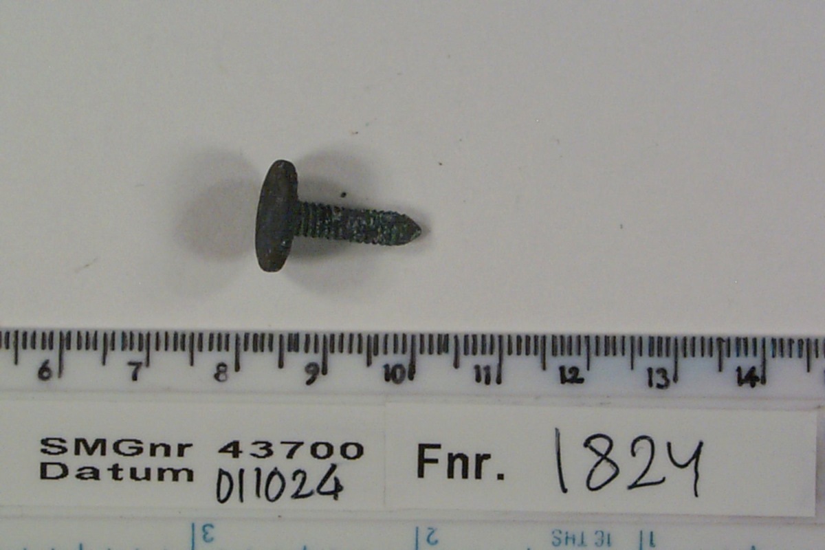 Skruv, ställskruv eller likn. med fina gängor med låg stigning. Skallen flat med räfflade kanter. Recent?