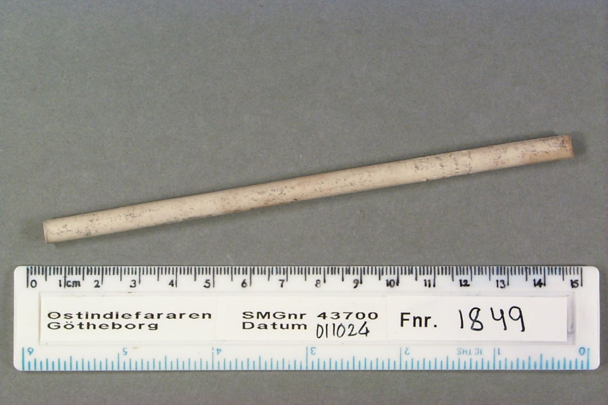 Föremålet är från vraket av ostindiefararen Götheborg, som gjorde tre resor till Kina 1739-45. Vid hemkomsten från den sista resan 12 september 1745 förliste fartyget vid grundet Hunnebådan strax utanför Nya Elfsborgs fästning. Vid flera tillfällen har material tagits upp från vraket. Föremålet kommer från de marinarkeologiska utgrävningarna på platsen 1986-1992.