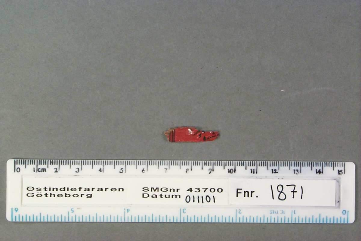 Föremålet är från vraket av ostindiefararen Götheborg, som gjorde tre resor till Kina 1739-45. Vid hemkomsten från den sista resan 12 september 1745 förliste fartyget vid grundet Hunnebådan strax utanför Nya Elfsborgs fästning. Vid flera tillfällen har material tagits upp från vraket. Föremålet kommer från de marinarkeologiska utgrävningarna på platsen 1986-1992.