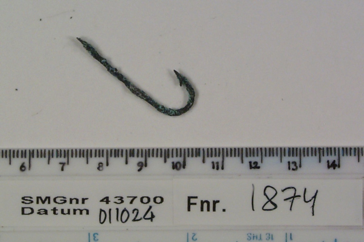 Metkrok, hulling i krokänden, förtjockning i andra änden, för fäste av tråd.