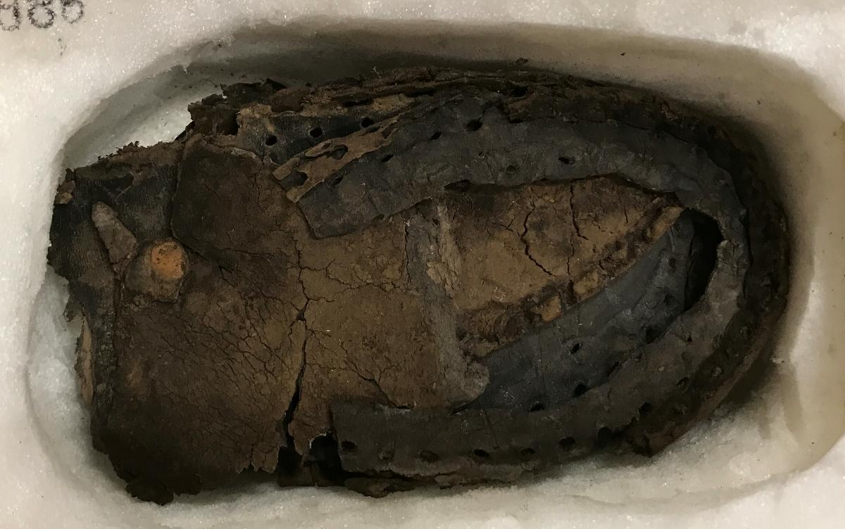 2) En bes, tillhörande hälbit 1). Sömshål för fastsättnin i sula och i hälkappa.