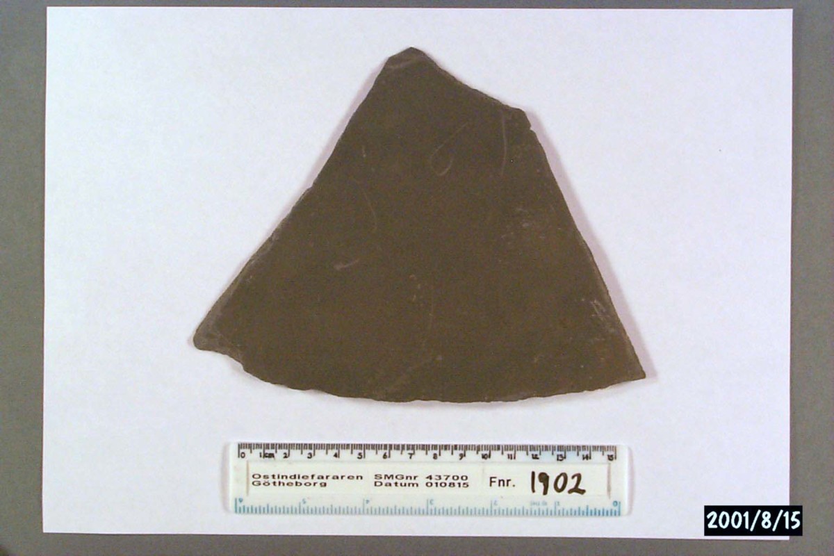 Föremålet är från vraket av ostindiefararen Götheborg, som gjorde tre resor till Kina 1739-45. Vid hemkomsten från den sista resan 12 september 1745 förliste fartyget vid grundet Hunnebådan strax utanför Nya Elfsborgs fästning. Vid flera tillfällen har material tagits upp från vraket. Föremålet kommer från de marinarkeologiska utgrävningarna på platsen 1986-1992.