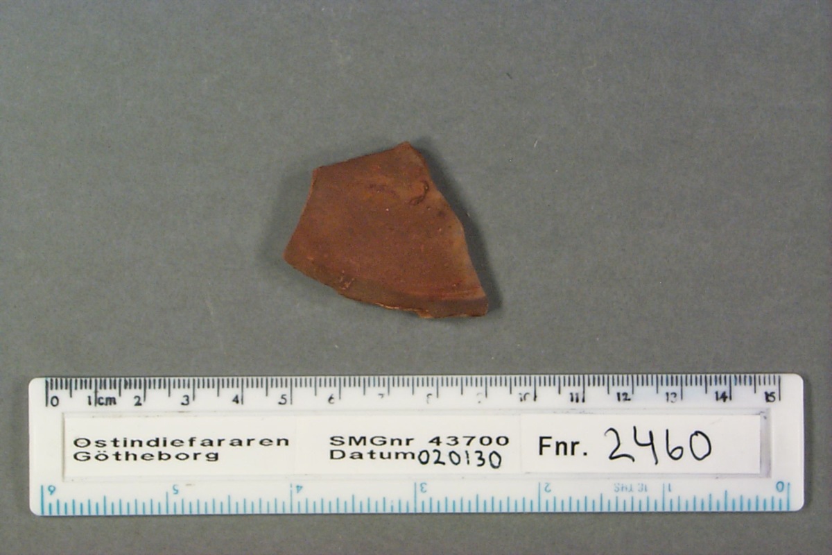 Föremålet är från vraket av ostindiefararen Götheborg, som gjorde tre resor till Kina 1739-45. Vid hemkomsten från den sista resan 12 september 1745 förliste fartyget vid grundet Hunnebådan strax utanför Nya Elfsborgs fästning. Vid flera tillfällen har material tagits upp från vraket. Föremålet kommer från de marinarkeologiska utgrävningarna på platsen 1986-1992.