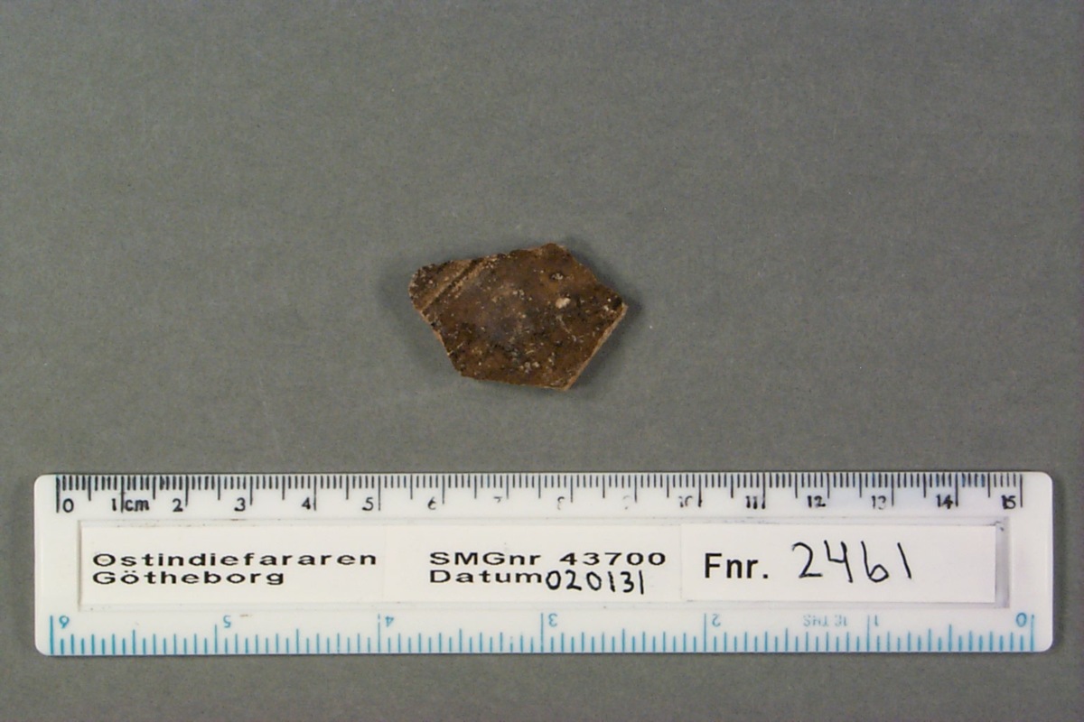 Föremålet är från vraket av ostindiefararen Götheborg, som gjorde tre resor till Kina 1739-45. Vid hemkomsten från den sista resan 12 september 1745 förliste fartyget vid grundet Hunnebådan strax utanför Nya Elfsborgs fästning. Vid flera tillfällen har material tagits upp från vraket. Föremålet kommer från de marinarkeologiska utgrävningarna på platsen 1986-1992.