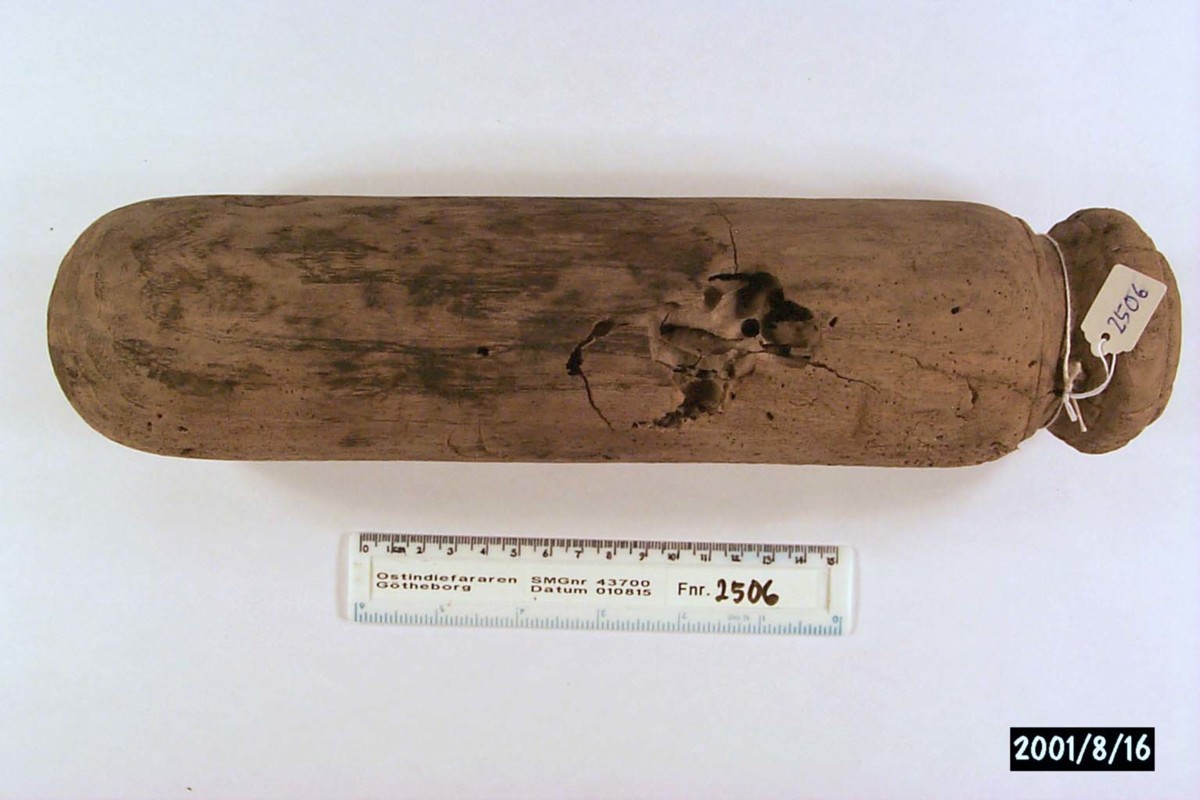 Föremålet är från vraket av ostindiefararen Götheborg, som gjorde tre resor till Kina 1739-45. Vid hemkomsten från den sista resan 12 september 1745 förliste fartyget vid grundet Hunnebådan strax utanför Nya Elfsborgs fästning. Vid flera tillfällen har material tagits upp från vraket. Föremålet kommer från de marinarkeologiska utgrävningarna på platsen 1986-1992.