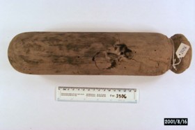 Laddningstillbehör med svarvat huvud, cylindriskt med rundad botten. Hål d: 30 mm, djup 255 mm i övre änden för skaft. Två genomgående hål för plugg, att fästa skaftet med, i midjan. Spikhål och korrosionsrester i en lodrät rad från övre änden ner under botten. Spår av tjära på ytan.