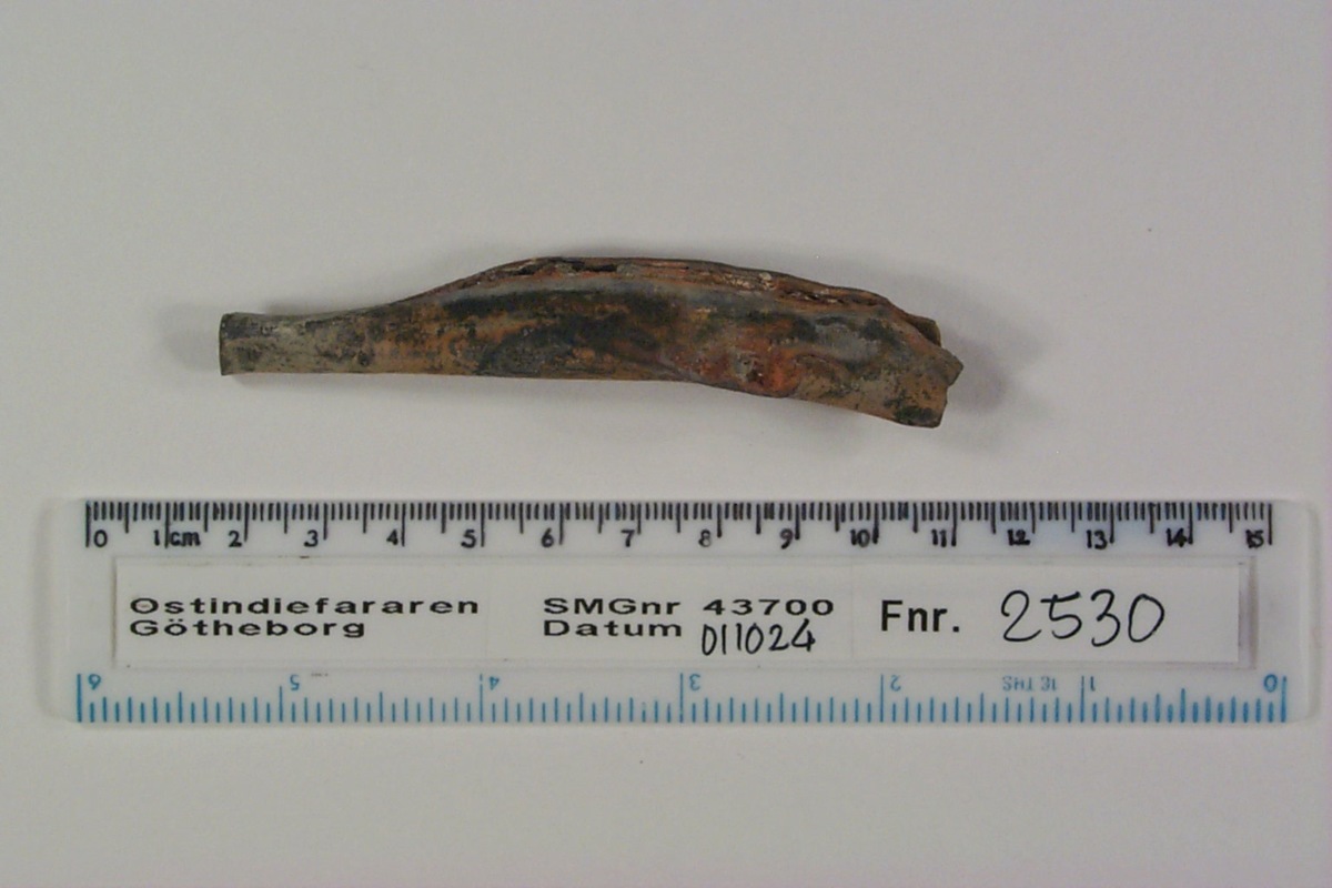 Föremålet är från vraket av ostindiefararen Götheborg, som gjorde tre resor till Kina 1739-45. Vid hemkomsten från den sista resan 12 september 1745 förliste fartyget vid grundet Hunnebådan strax utanför Nya Elfsborgs fästning. Vid flera tillfällen har material tagits upp från vraket. Föremålet kommer från de marinarkeologiska utgrävningarna på platsen 1986-1992.