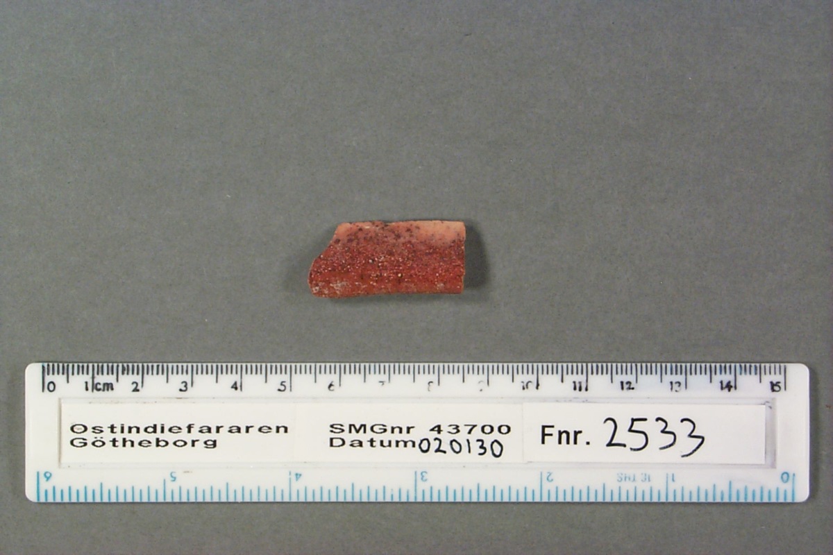Skärva av kärl, kantdel, avbruten neråt, rundad kant uppåt. Tegelfärgat gods, röd glasyr på utsidan.
