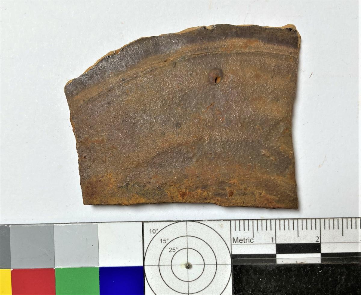 Skärva av kärl, flat, del av botten. Spår efter tillverkning/drejning.