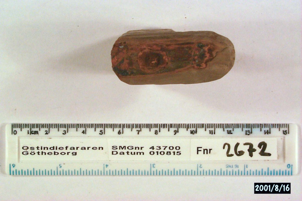 Föremålet är från vraket av ostindiefararen Götheborg, som gjorde tre resor till Kina 1739-45. Vid hemkomsten från den sista resan 12 september 1745 förliste fartyget vid grundet Hunnebådan strax utanför Nya Elfsborgs fästning. Vid flera tillfällen har material tagits upp från vraket. Föremålet kommer från de marinarkeologiska utgrävningarna på platsen 1986-1992.