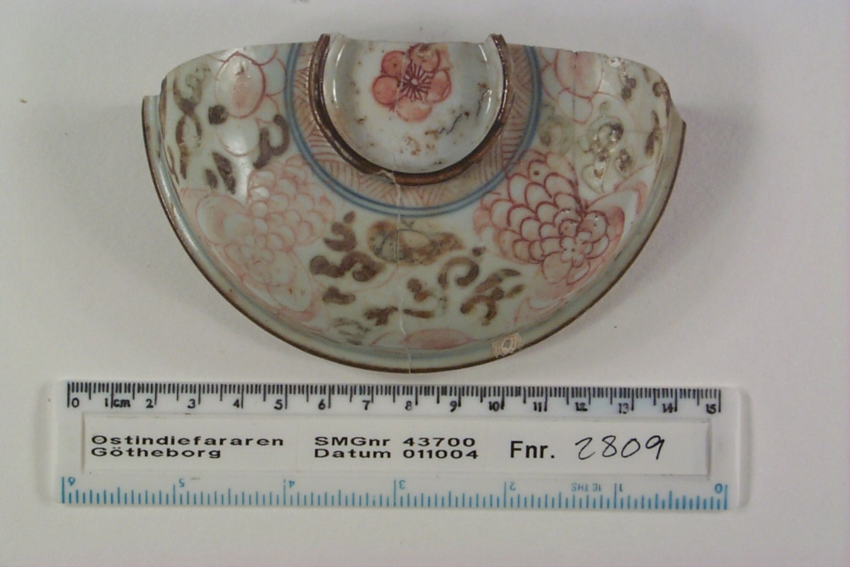 Föremålet är från vraket av ostindiefararen Götheborg, som gjorde tre resor till Kina 1739-45. Vid hemkomsten från den sista resan 12 september 1745 förliste fartyget vid grundet Hunnebådan strax utanför Nya Elfsborgs fästning. Vid flera tillfällen har material tagits upp från vraket. Föremålet kommer från de marinarkeologiska utgrävningarna på platsen 1986-1992.